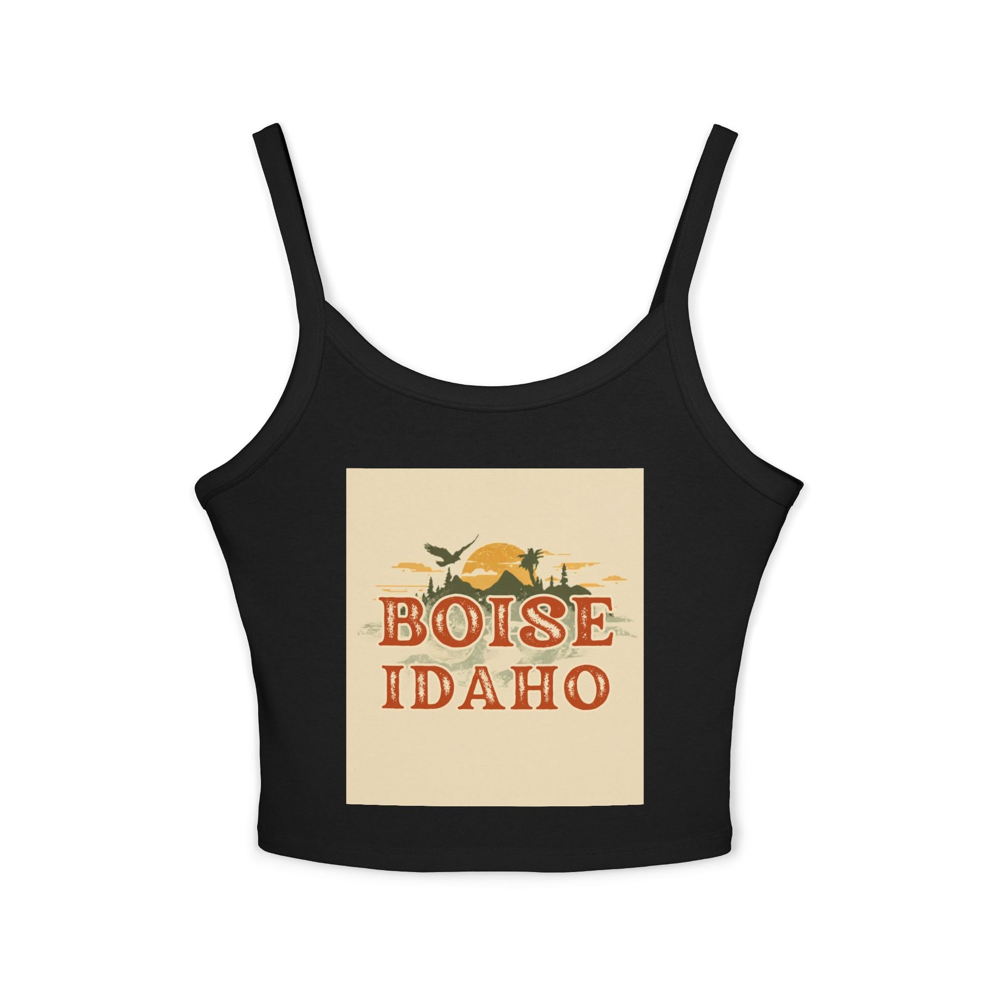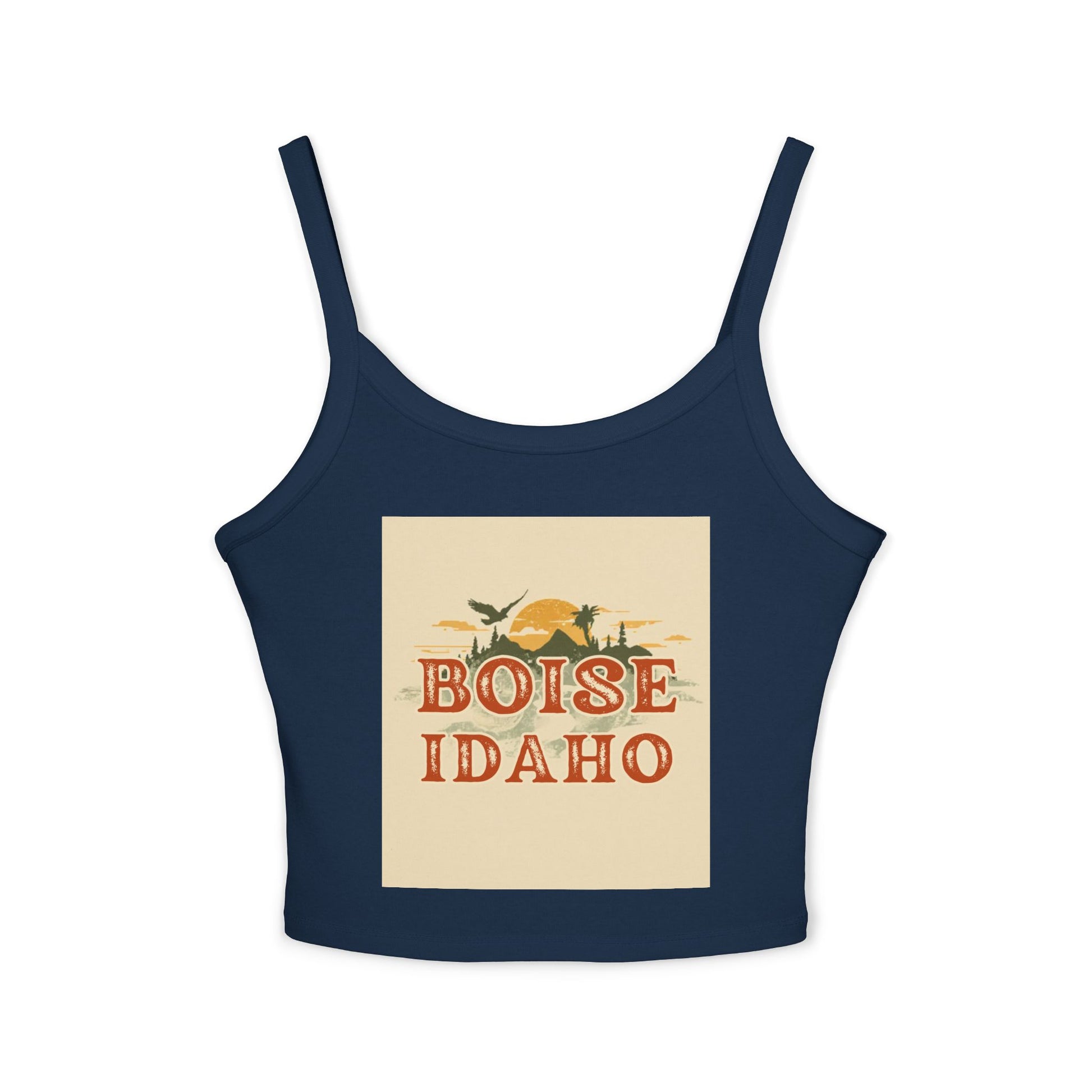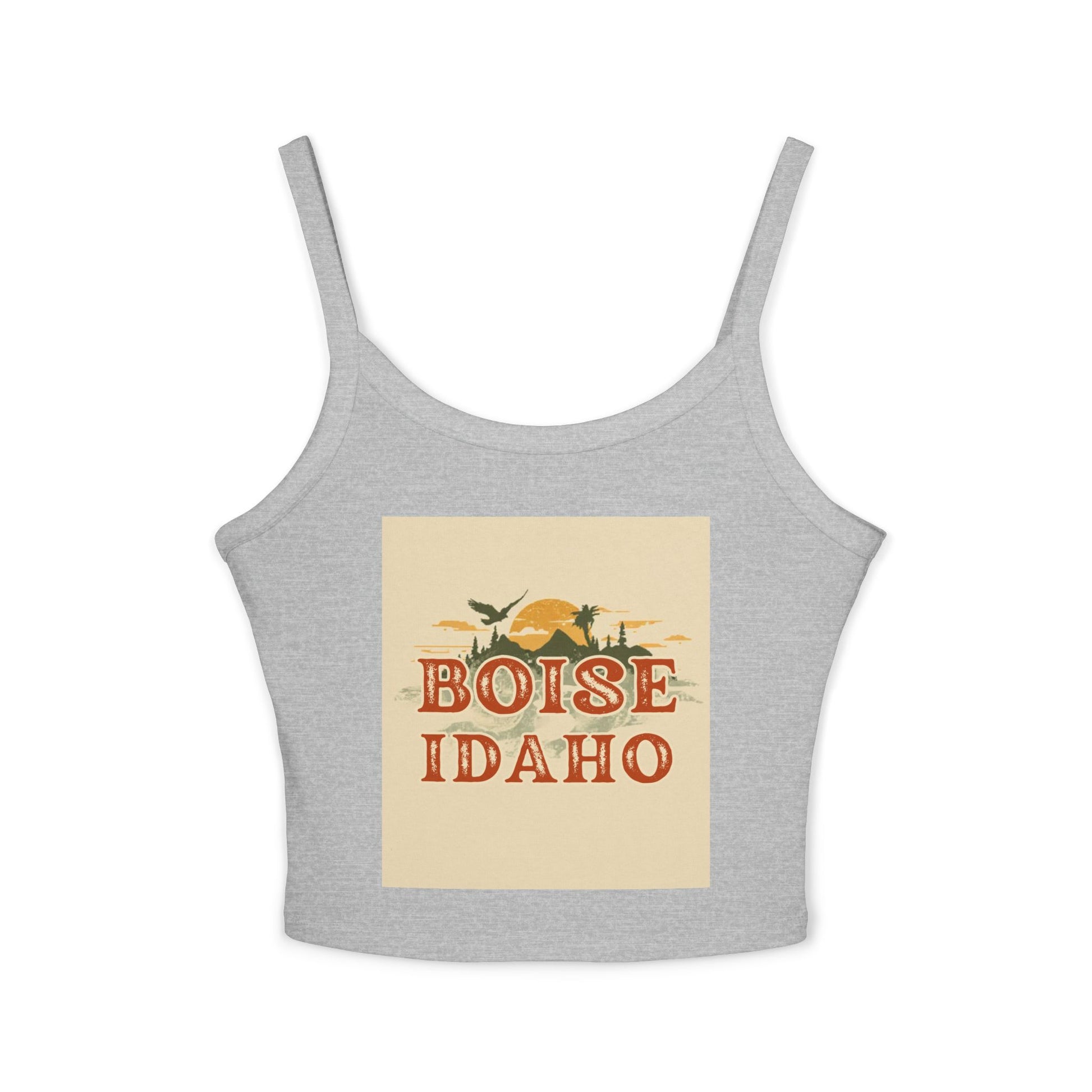 Light, confident, and made to move — this fitted spaghetti-strap tank brings Boise energy to everyday wear. The mid-length cut sits just right for layering under a jacket or going solo on warm days. Thick straps give reliable support while the soft Airlume combed ring-spun cotton blend feels smooth against skin. The vintage-inspired Boise, Idaho artwork adds a sunlit, outdoorsy vibe that pairs with weekend markets, river walks, or a casual night out with friends. Made in a socially conscious facility and printed with DTF for durable color that holds up to frequent wear, this tank becomes one of those pieces you reach for when you want comfort and effortless local pride.