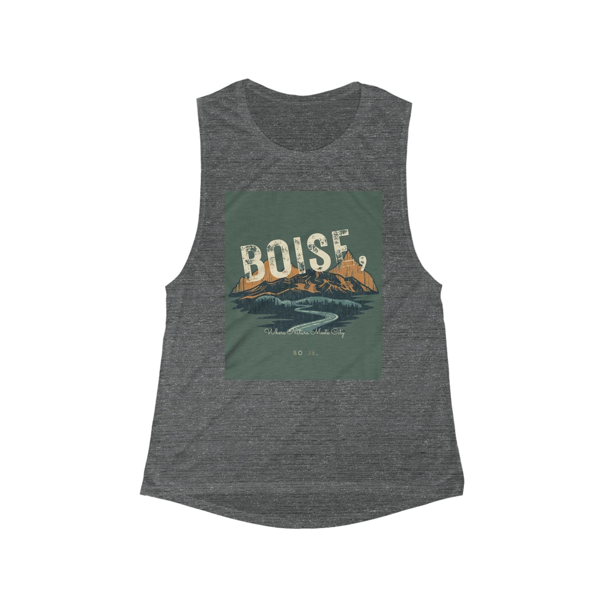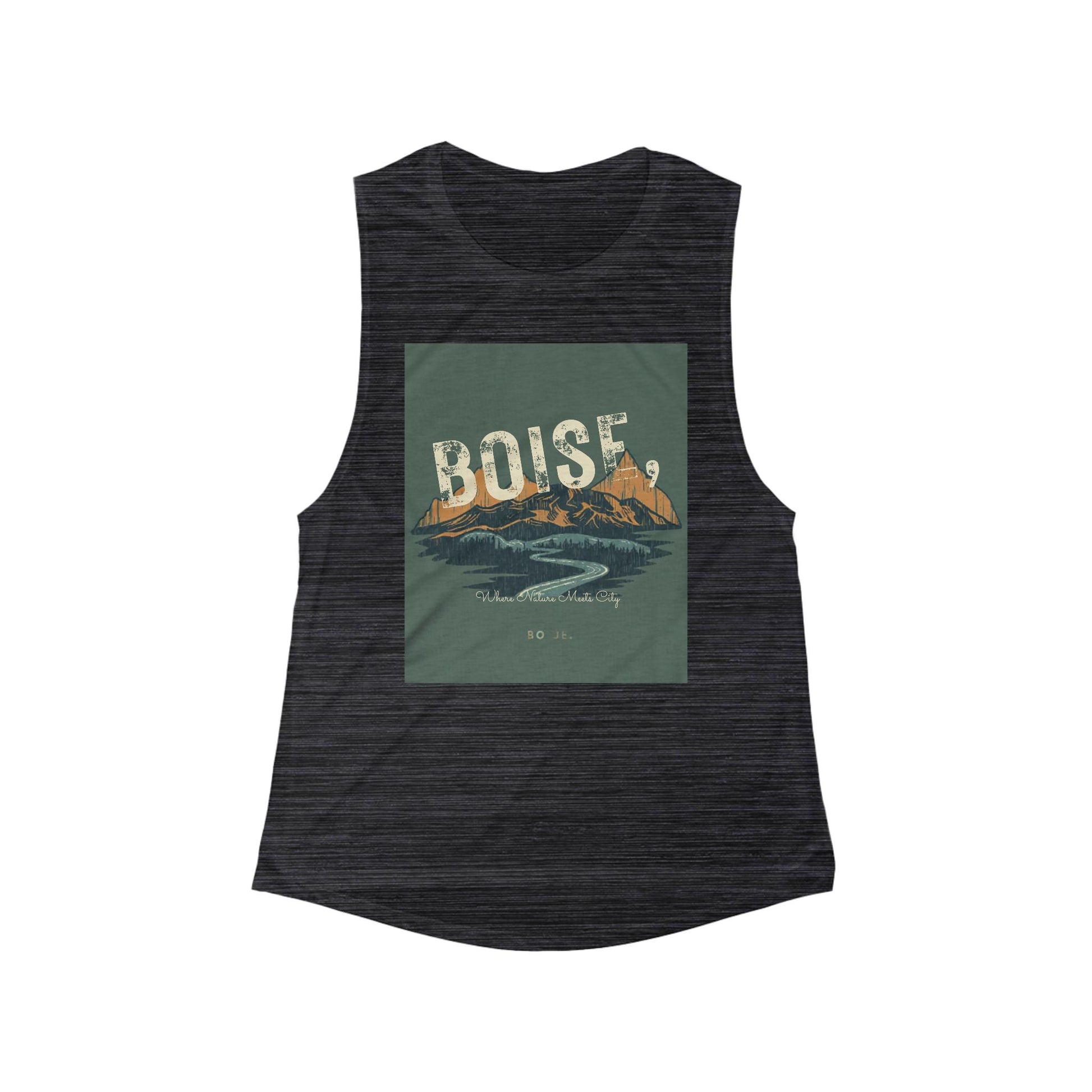 Light and airy with a worn-in outdoor spirit — this flowy scoop muscle tank carries a vintage mountain scene that reads "Boise" across a winding river and sunset peaks. The relaxed silhouette and extra-light fabric move with you on warm mornings, park runs, and coffee-shop strolls. It layers easily under a flannel or stands alone for hot afternoons when you want breathable comfort without feeling confined. The soft drape flatters while the slightly shorter, racer-style arm openings let your shoulders breathe. Wear it for trail days, travel, or lazy weekends when you want a quiet reminder of wide skies and river bends.