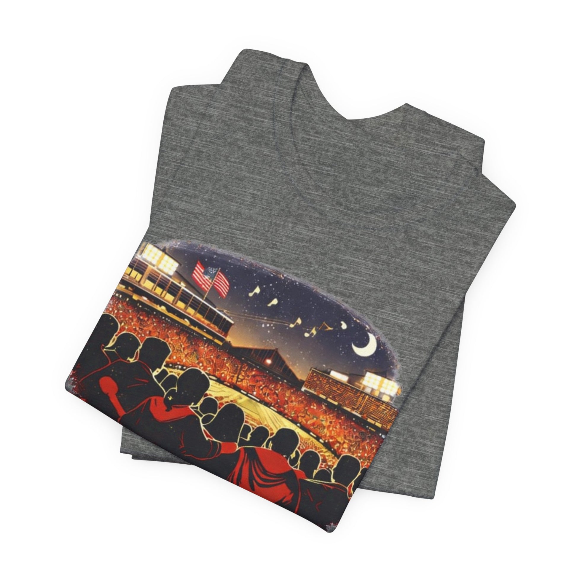 Lightweight, soft, and responsibly made — this tee carries the warmth of a shared evening under stadium lights. A crowd scene stretches across the chest: friends arm-in-arm, the glow of stands, and a crescent moon overhead. The faded-ink look and warm heather color give it a lived-in, vintage feel that blends easily from a weekend tailgate to a relaxed night out. Wear it when you want a quiet reminder of belonging, celebration, and stories told between plays.