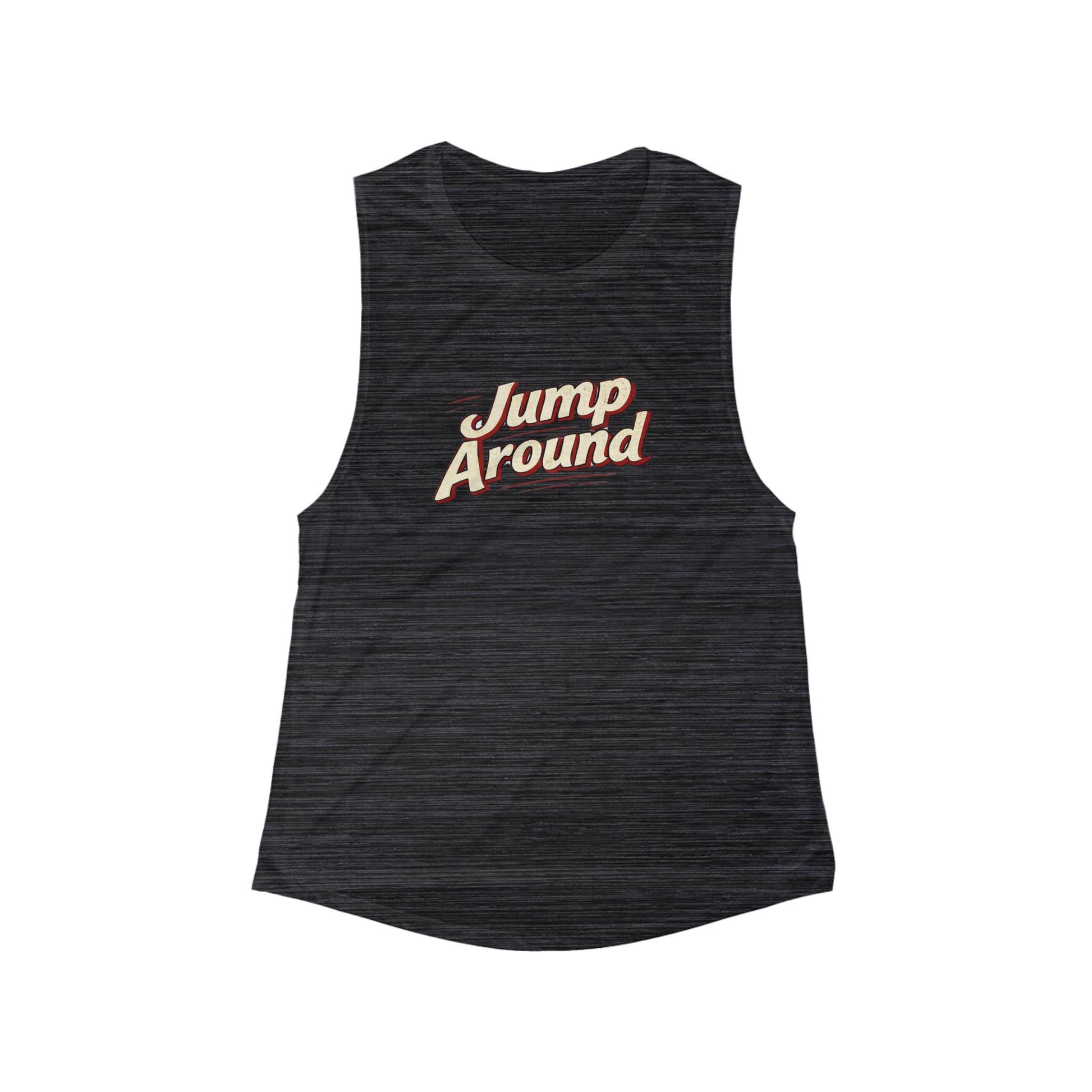 Bring playful energy to your wardrobe with the Jump Around Women Flowy Scoop Muscle Tank Top. Featuring a retro-inspired script across the chest, this lightweight, flowy scoop tank combines casual style with activewear functionality. Perfect for HIIT workouts, morning jogs, festival days, errands, or layering over a sports bra or under a jacket, this women’s tank balances comfort, movement, and subtle personality.