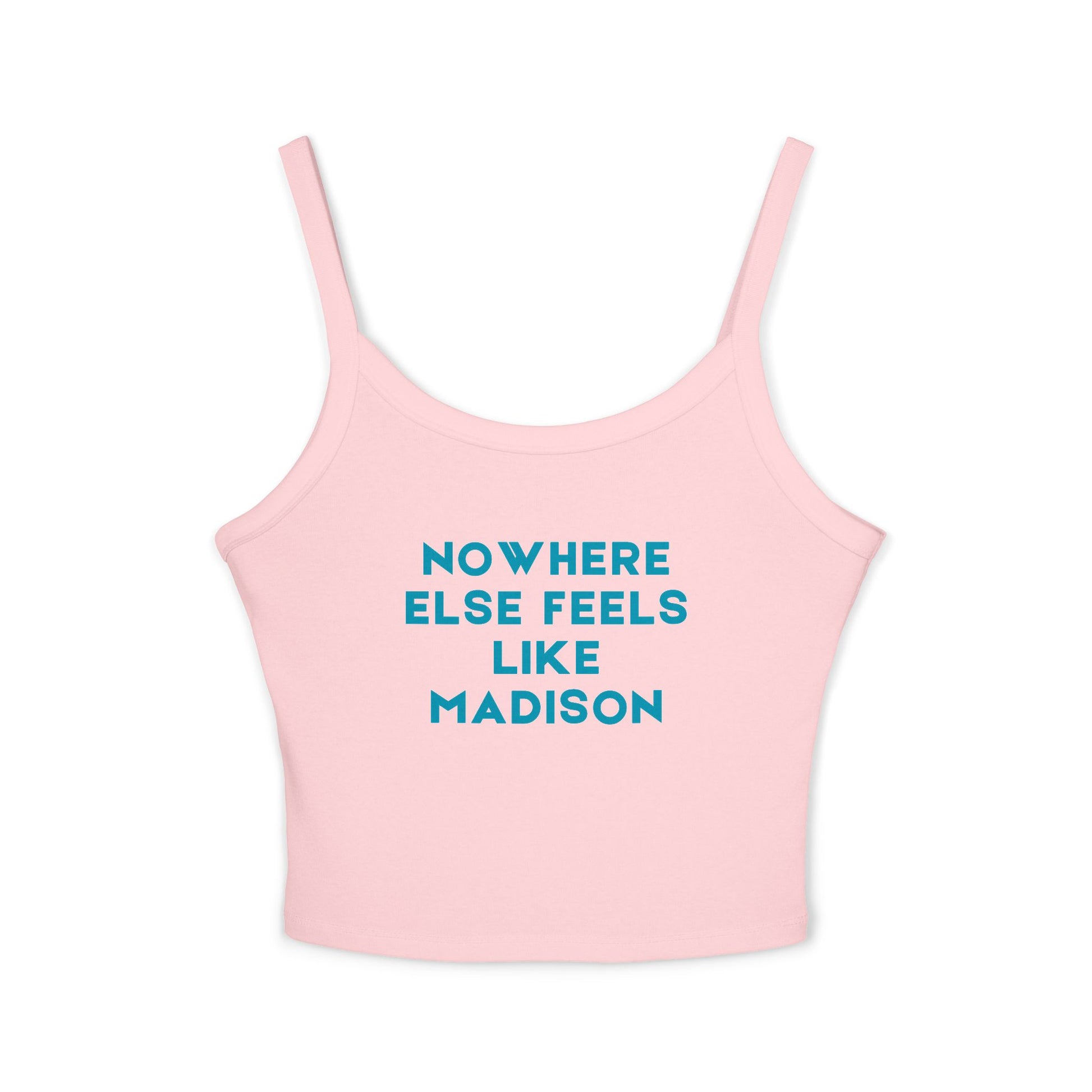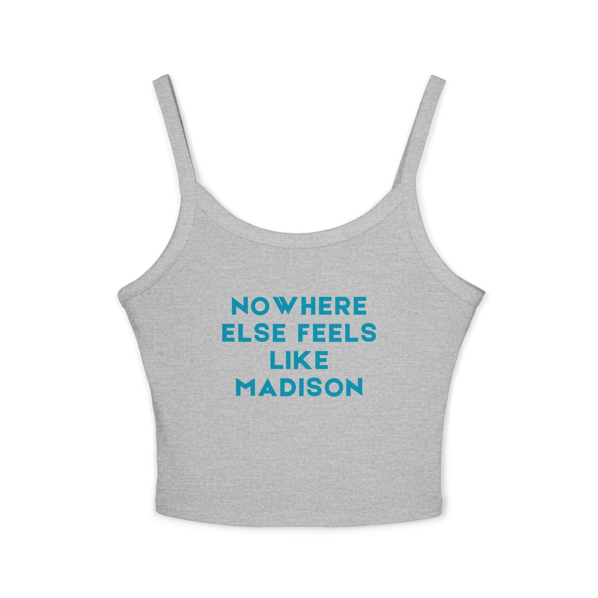 Celebrate hometown pride with the Madison Pride Women Spaghetti Tank Top, featuring the heartfelt Nowhere Else Feels Like Madison slogan across the front. Designed with a flattering mid length fitted silhouette, this women’s crop tank delivers quiet confidence and modern style for warm days and effortless layering. Perfect for summer markets, coffee runs, campus events, festivals, casual nights out, or pairing with high waist jeans and skirts, this tank blends comfort, personality, and everyday versatility.