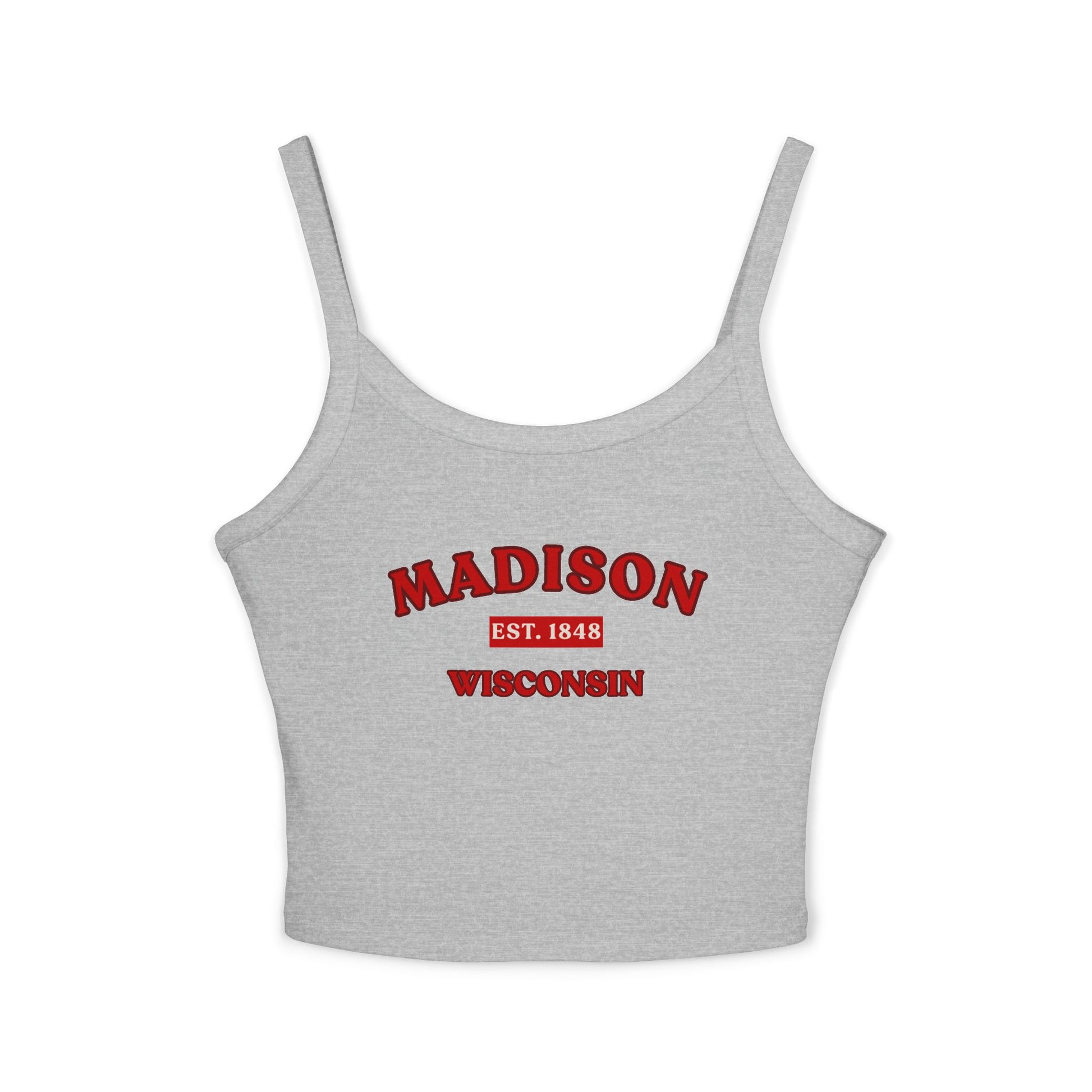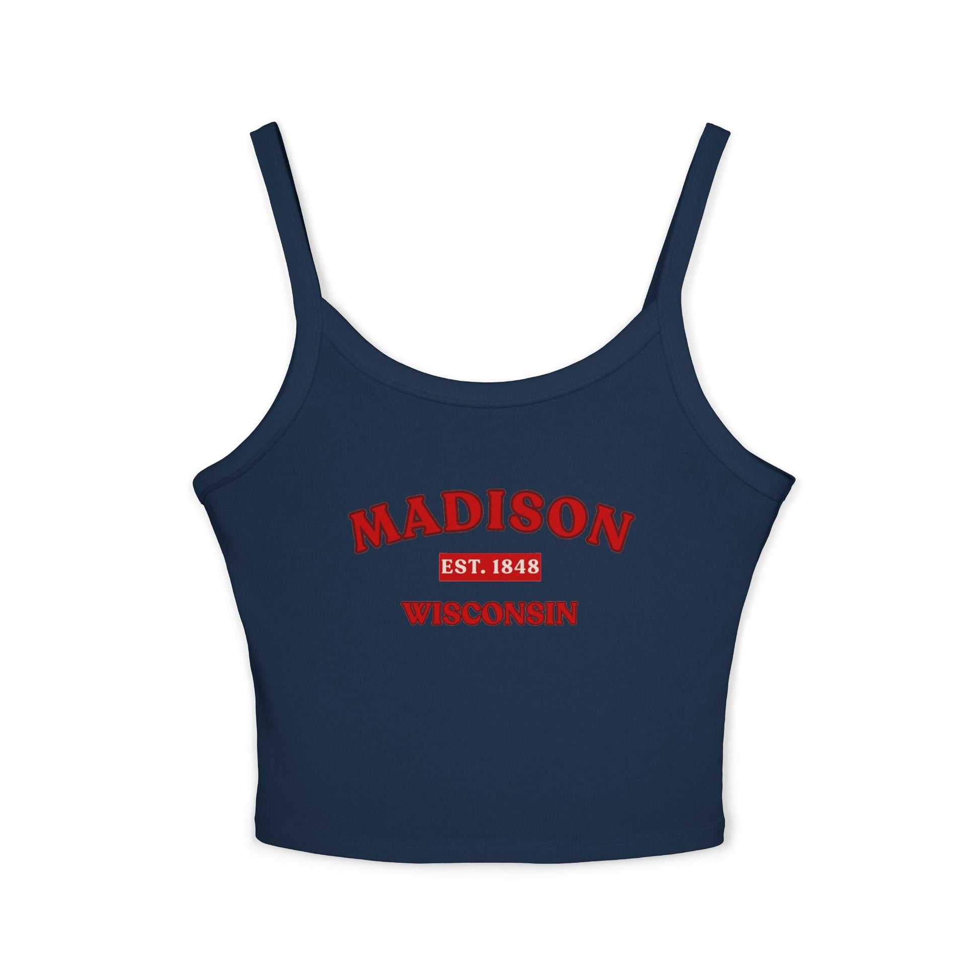 Celebrate hometown pride with the Madison Wisconsin Women Spaghetti Strap Tank Top, designed with a retro collegiate aesthetic and effortless everyday comfort. Featuring a vintage inspired Madison Est. 1848 graphic across the front, this women’s crop tank delivers a classic university style look with a slightly weathered print for that timeless, lived in feel. Perfect for campus events, summer outings, casual streetwear, festivals, vacations, or layering under an open shirt or flannel, this fitted spaghetti strap tank blends local pride with modern versatility.