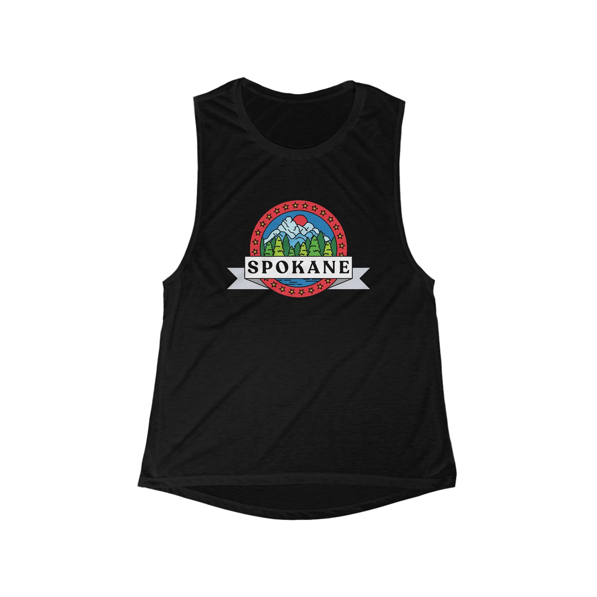 This lightweight flowy scoop muscle tank carries a relaxed, sun-ready energy for days spent outdoors around Spokane. The centered badge-style design features mountains, evergreens, and a retro ribbon banner that reads “Spokane,” giving the top local pride with a vintage, trail-ready mood. Wear it over a sports bra for morning runs, layered under a flannel for brewery nights, or tied at the waist for farmers market strolls. The soft, drapey fabric and ribbed scoop collar move with you and breathe easily on warm afternoons. It’s for those who collect trailheads and coffee shops, who like their wardrobe comfortable but unmistakably tied to place and adventure.