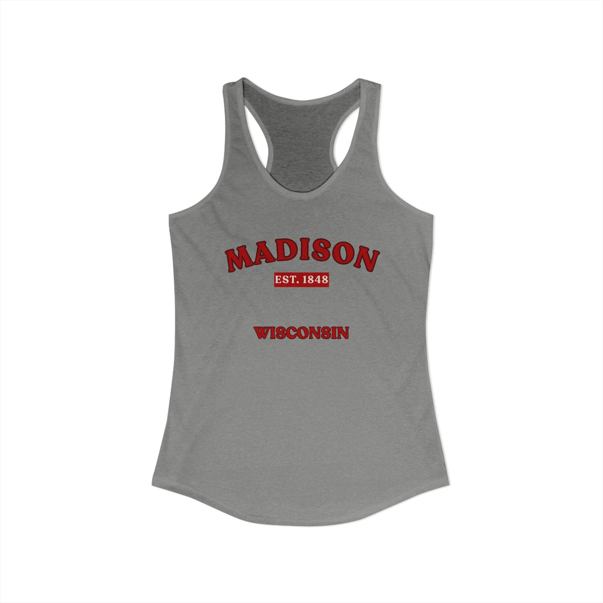 Celebrate hometown pride with the Madison Est. 1848 Women’s Ideal Racerback Tank Top. This slim fit tank provides a flattering, sporty silhouette that highlights the shoulders and chest while remaining versatile for workouts, layering, or casual everyday wear. The high-quality print keeps crisp, long-lasting detail that emphasizes the iconic name and heritage.